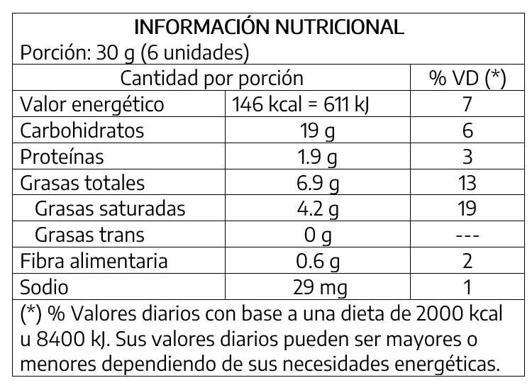 Harina de trigo enriquecida (*), cobertura símil chocolate (azúcar, aceite vegetal, cacao en polvo, emulsionante: lecitina de soja (INS 322), aromatizante/saborizante: vainillina), azúcar, aceite vegetal, almidón de maíz, jarabe de alta fructosa, sal, leudantes químicos: bicarbonato de sodio (INS 500ii) y bicarbonato de amonio (INS 503ii), emulsionante: lecitina de soja (INS 322), saborizantes/aromatizantes. (*) Para Uruguay: harina de trigo enriquecida según Decreto 130/006: hierro 30 mg/kg, ácido fólico 2,4 mg/kg. Contiene derivados de trigo y soja. Puede contener derivados de avena, cebada, centeno, coco y sésamo. Conservar en lugar fresco y seco.