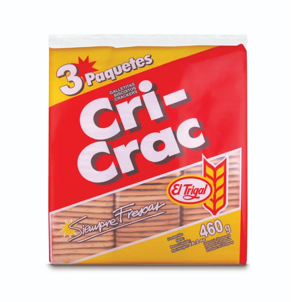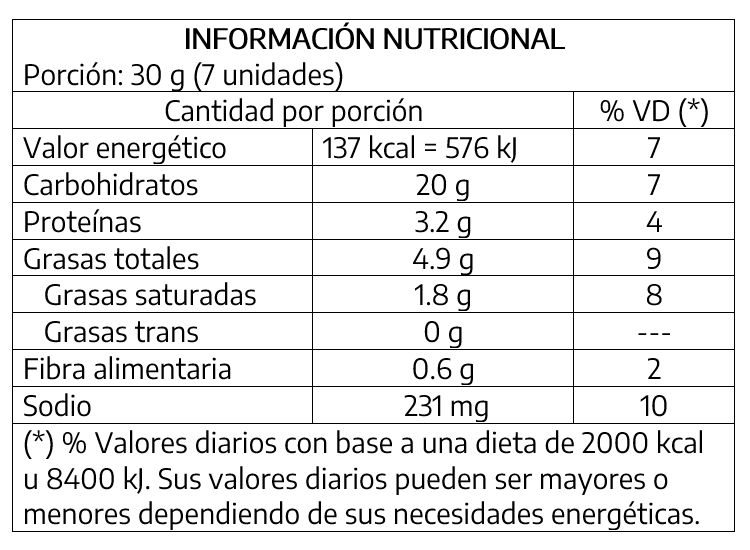 Harina de trigo enriquecida(*), grasa vacuna refinada, aceite vegetal, sal, jarabe de fructosa, extracto de malta, levadura, regulador de acidez: bicarbonato de sódio (INS 500ii), emulsionante: lecitina de soja (INS 322). (*)Para Uruguay: harina de trigo enriquecida según Decreto 130/006. (Contiene hierro: 30 mg/kg; ácido fólico: 2,4 mg/kg). Contiene derivados de trigo, CEBADA Y SOJA. PUEDE CONTENER DERIVADOS DE AVENA, CENTENO, sésamo y COCO. Conservar en lugar fresco y seco.