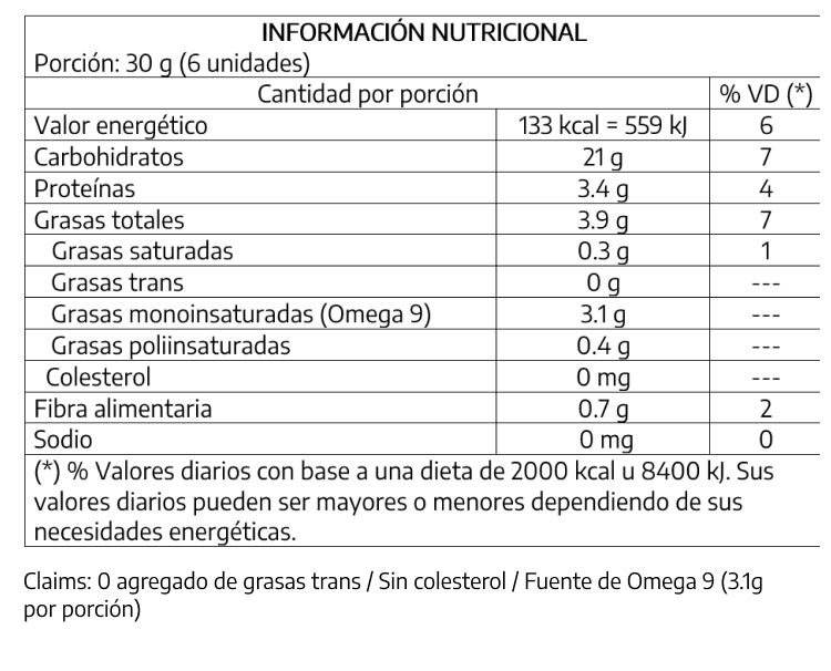 Harina de trigo enriquecida(*), aceite de girasol alto oleico, harina de malta, levadura, emulsionante: lecitina de soja (INS 322), aromatizante/ saborizante. (*)Para Uruguay: harina de trigo enriquecida según Decreto 130/006. (Contiene hierro: 30 mg/kg; ácido fólico: 2,4 mg/kg). Contiene derivados de trigo, CEBADA y SOJA. PUEDE CONTENER DERIVADOS DE AVENA, CENTENO, sésamo Y coco. Conservar en lugar fresco y seco.