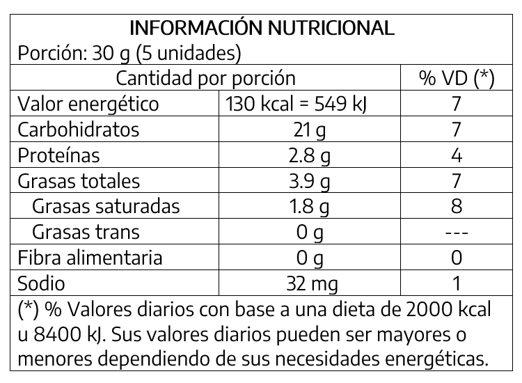 Harina de trigo enriquecida (*), azúcar, aceite vegetal, jarabe de fructosa, leche en polvo, sal, leudantes químicos: bicarbonato de sodio (INS 500ii), bicarbonato de amonio (INS 503ii) y fosfato monocálcico (INS 341i), saborizantes/aromatizantes, emulsionante: lecitina de soja (INS 322). (*) Para Uruguay: harina de trigo enriquecida según Decreto 130/006: hierro 30 mg/kg, ácido fólico 2,4 mg/kg. CONTIENE DERIVADOS DE TRIGO, LECHE Y SOJA. PUEDE CONTENER derivados de avena, cebada, huevo y frutos secos. Conservar en lugar fresco y seco.