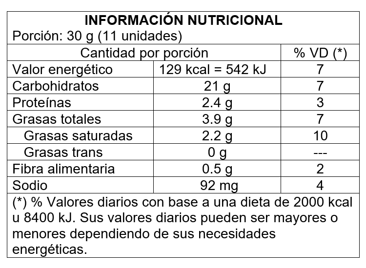 Harina de trigo enriquecida(*), azúcar, grasa vacuna refinada, jarabe de fructosa, miel, sal, leudantes químicos: bicarbonato de amonio (INS 503ii), bicarbonato de sodio (INS 500ii) y fosfato monocálcico (INS 341i), emulsionante: lecitina de soja (INS 322), saborizante/aromatizante. (*) Para Uruguay: harina de trigo enriquecida según Decreto 130/006: hierro 30 mg/kg, ácido fólico 2,4 mg/kg. CONTIENE DERIVADOS DE TRIGO Y SOJA. PUEDE CONTENER DERIVADOS DE LECHE, AVENA, CEBADA, HUEVO Y FRUTOS SECOS. Conservar en lugar fresco y seco.