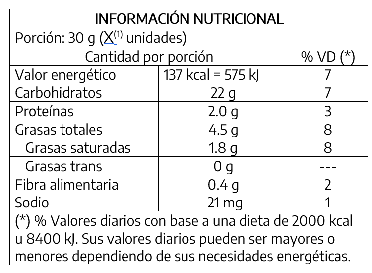 Harina de trigo enriquecida (*), azúcar, grasa vacuna refinada, miel, almidón de maíz, aceite de girasol alto oleico, leudantes químicos: bicarbonato de sodio (INS 500ii), bicarbonato de amonio (INS 503ii) y fosfato monocálcico (INS 341i), emulsionante: lecitina de soja (INS 322), saborizantes/aromatizantes. (*)Para Uruguay: harina de trigo enriquecida según Decreto 130/006. (Contiene hierro: 30 mg/kg; ácido fólico: 2,4 mg/kg). Contiene derivados de trigo Y SOJA. PUEDE CONTENER DERIVADOS DE cebada, COCO, SÉSAMO, AVENA Y CENTENO. Conservar en lugar fresco y seco.