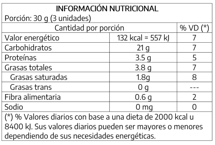Harina de trigo enriquecida(*), grasa vacuna refinada, aceite vegetal, sal, levadura, extracto de malta, regulador de acidez: bicarbonato de sodio (INS 500ii), emulsionante: lecitina de soja (INS 322). (*)Para Uruguay: harina de trigo enriquecida según Decreto 130/006. (Contiene hierro: 30 mg/kg; ácido fólico: 2,4 mg/kg). CONTIENE DERIVADOS DE TRIGO, CEBADA Y SOJA. PUEDE CONTENER DERIVADOS DE AVENA, CENTENO, COCO Y SÉSAMO. Conservar en lugar fresco y seco.