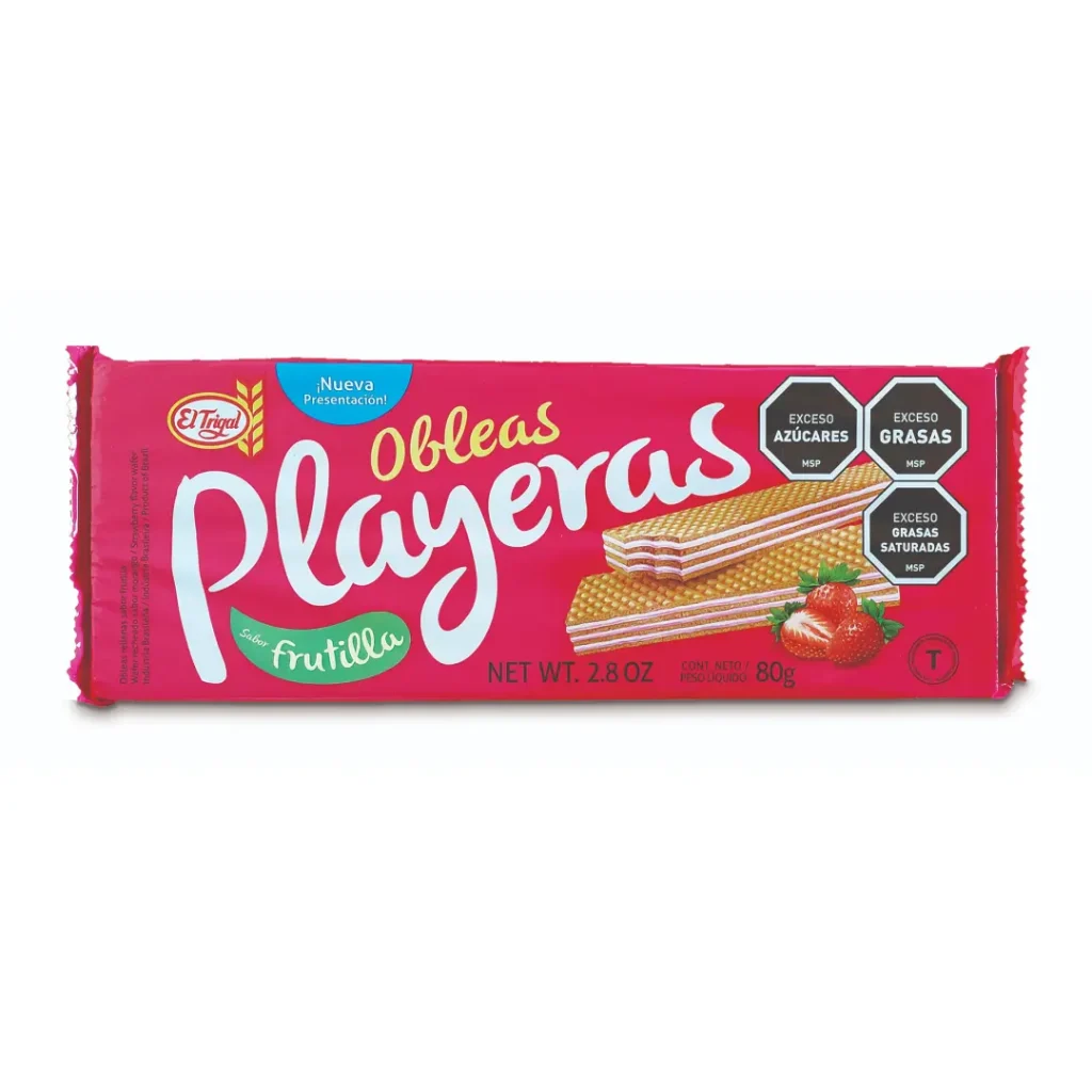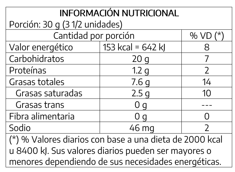 Azúcar, harina de trigo enriquecida (*), grasa vegetal, almidón de maíz, sal, lactosuero en polvo, emulsionante: lecitina de soja (INS 322), aromatizante/ saborizante, acidulante: ácido láctico (INS 270), colorante natural carmín (INS 120), leudantes químicos: bicarbonato de sodio (INS 500ii) y bicarbonato de amonio (INS 503ii), mejorador de harina: proteasa (INS 1101i). (*)Para Uruguay: harina de trigo enriquecida según Decreto 130/006. (Contiene hierro: 30 mg/kg; ácido fólico: 2,4 mg/kg). CONTIENE DERIVADOS DE TRIGO, LECHE Y SOJA. PUEDE CONTENER DERIVADOS DE AVENA, CENTENO, CEBADA, MANI, CASTAÑA DE CAJU Y SÉSAMO. Conservar en lugar fresco y seco.